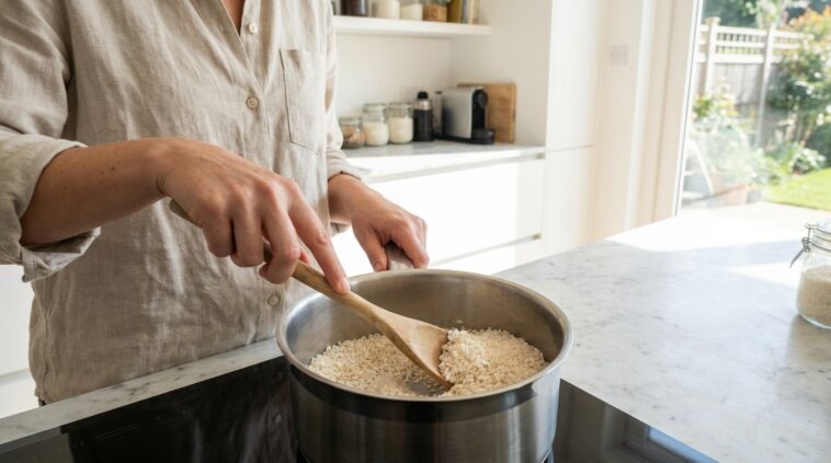 Dès que le gras est à température, versez directement la céréale sèche, brute et intacte. Armé d’une spatule en bois, il faut remuer vivement pendant exactement trente secondes. Sous l’effet de la chaleur rayonnante, un phénomène magique se produit : le nacrage. Chaque composant s’enrobe imperceptiblement, modifiant son enveloppe extérieure pour prendre une jolie teinte translucide, semblable à une nacre délicate. Ce léger massage thermique scelle la surface de manière invisible, empêchant la fuite excessive d’amidon tout en construisant une carapace protectrice qui gardera l’intérieur parfaitement intact lors de l’absorption ultérieure.