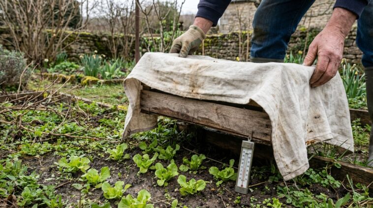 La caisse retournée offre une structure solide, mais ses lattes ajourées laissent passer l’air glacé de la nuit. C’est ici qu’intervient le linge de maison oublié au fond d’une armoire. Inutile d’investir dans une bâche thermique ou un voile d’hivernage synthétique ; un simple drap en coton épais, aux fibres naturelles, remplit merveilleusement ce rôle. En enveloppant la cagette avec ce tissu, on lui confère la capacité de capturer la chaleur terrestre accumulée dans le sol durant la journée. La terre agit alors comme un radiateur naturel, et le drap empêche sa douce diffusion de se perdre dans l’atmosphère froide au cœur de la nuit. Ce bouclier thermique improvisé se montre d’une efficacité surprenante pour retenir les quelques degrés qui font toute la différence.